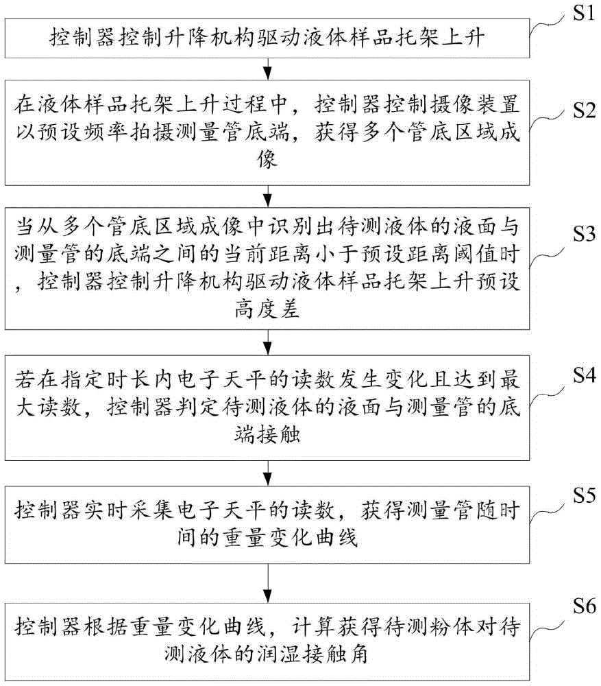 粉體材料潤濕接觸角測量方法應用于表面張力儀,所述表面張力儀包括殼體以及設置于殼體內的電子天平、底端用微孔板封閉的測量管、液體樣品托架、升降機構和攝像裝置;所述電子天平的底部設置有連接桿,所述連接桿與所述電子天平的稱重盤固定連接,所述測量管垂直懸掛于所述連接桿下方,所述測量管的底端位于所述攝像裝置的攝影取景范圍中,所述測量管內裝有待測粉體,所述液體樣品托架用于固定裝盛有待測液體的樣品容器,所述液體樣品托架由所述升降機構驅動升降;所述測量方法包括: