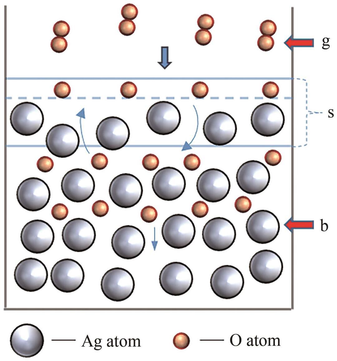 根據圖1,首先O2分子從氣相(g)擴散至表面相(s);其次在Ag的催化下解離為O原子,并發生化學吸附;最后,O原子從表面相(s)擴散至本體相(b)。整個過程可以表示為: