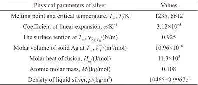 式(7)表示在整個溫度范圍內,液態Ag的表面張力與溫度的關系,相關參數的取值列于表1[21-26]。