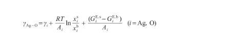 式中,γAg-O表示Ag-O系的表面張力(N/m),γi表示純組分i的表面張力(N/m),R為氣體常數[J/(mol·K)],x和x分別表示組分i在表面相和本體相中的摩爾分數(mol/mol),Ai為組分i的摩爾表面積(m2/mol),G和G分別表示表面相和本體相中組分i的偏摩爾過剩自由能(J/mol),并且G=λG,其中λ為表面相和本體相的原子配位數之比[27]。G可由摩爾過剩自由能GE,b表示,其關系式為: