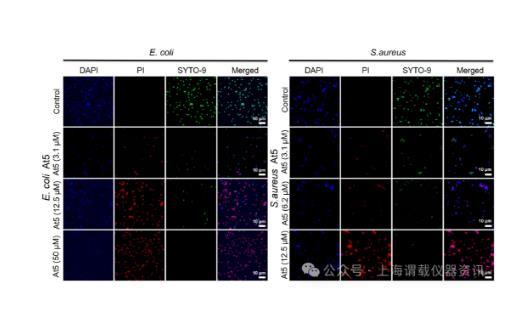圖5、大腸桿菌和金黃色葡萄球菌在37°C下用不同濃度的At5肽處理2小時前后的活/死染色(×100放大倍數,比例尺=10μm)。