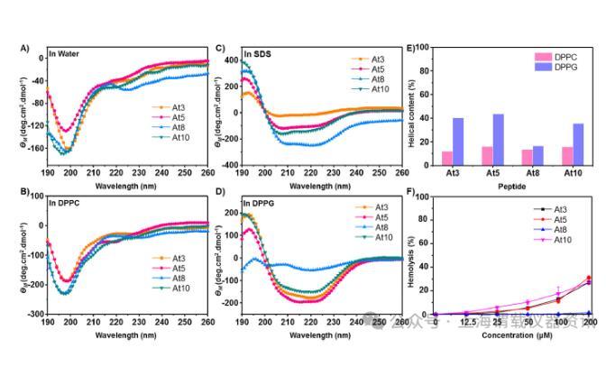圖2、設計肽的二級結構和溶血特性。(A)水、(B)25 mM SDS、(C)兩性離子DPPC SUV(0.25 mg mL-1)和(D)帶負電荷的DPPG SUV(0.25 mg mL-1)中肽的CD光譜。所有四種肽(At3、At5、At8、At10)在水和DPPC SUV中均呈現無規卷曲結構,而在SDS和DPPG SUV中均采用螺旋結構。肽濃度固定在0.1 mM。所有測量均在室溫下進行。(E)DPPC和DPPG SUV中肽的α-螺旋含量。(F)肽的溶血活性。用不同濃度的肽處理人紅細胞(hRBC)并在37°C下孵育1小時。然后在OD540nm處測量吸光度。