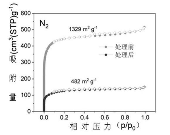 步驟1所用活性碳纖維以及本實施例制備得到的高能量轉化效率的碳材料的氮氣吸脫附測試可以看出:制備前活性碳纖維的氮氣吸脫附測出比表面積為1329m2/g,經過處理,比表面積降至482m2/g,說明蒽在孔內的沉積改變了孔的結構,減小了孔容,孔腹尺寸被收縮;