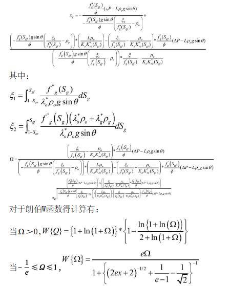 將速度場方程與氣體分流率方程結合,在遵循氣體質量守恒的基礎上,從CO2入口端到混相帶前緣對含氣飽和度進行積分,并用朗伯W函數求解得出混相前緣的位置,其表達式如下: