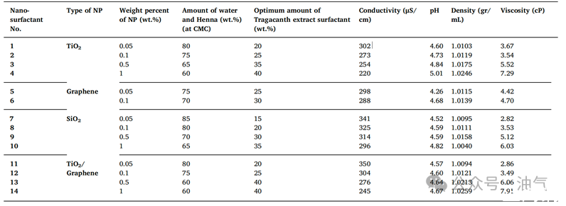 本研究研究了石墨烯、二氧化鈦(TiO2)和二氧化硅(SiO2)納米顆粒、TiO2和石墨烯的復合納米粒子以及指甲花提取物表面活性劑的納米復合物對降低油水界面張力的影響。研究人員使用溶膠-凝膠技術合成上述納米顆粒,并采用天然水性懸浮表面活性劑(黃芪膠提取物)對納米表面活性劑的穩定性進行了研究。通過電導率、濁度和界面張力實驗測定了指甲花提取物表面活性劑的CMC值。為了穩定重量百分比不同且納米顆粒類型也不同的納米表面活性劑,使用粒徑和zeta電位測量來確定黃芪膠表面活性劑各自的最佳濃度。最后,通過界面張力測量,使用穩定的納米表面活性劑來研究其對IFT的影響。