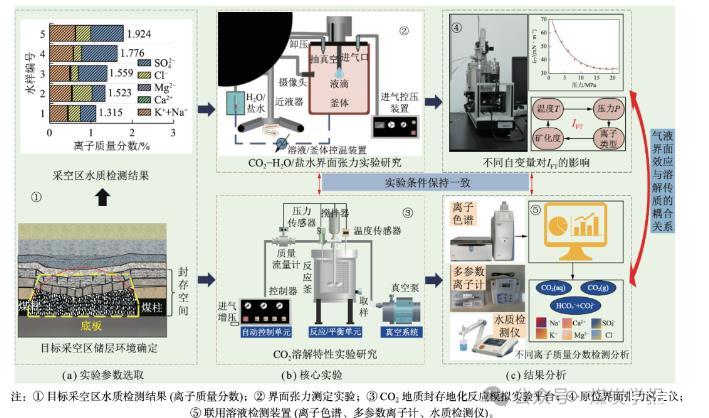 采空區CO2封存作為解決煤炭行業碳排放難題的重要負碳技術儲備,在采空區廢棄資源二次利用、CO2封存等方面具有廣泛的應用前景。利用原位界面張力測定儀開展了不同溫壓、地層水礦化度及陽離子溶液類型對CO2地層水系統的界面張力(IFT)影響規律實驗,明晰了CO2注入含水碎脹煤巖體中的氣液界面擴散效應,并將基于統計締合理論結合蘭納?瓊斯勢能模型的狀態方程(SAFT-LJ狀態方程)與密度梯度理論(DGT)結合預測了IFT理論值;利用自主研發的地質封存地化反應模擬實驗平臺對相同條件下的CO2溶解性進行了探究實驗,得到了采空區儲層環境下CO2溶解度變化特征,采用D-S模型計算了對應CO2溶解度理論值。