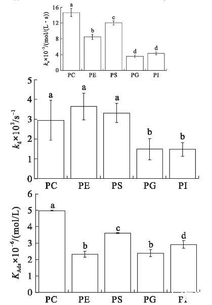 圖2初始表面壓力15 mN/m的條件下VhPLD對PC、PE、PS、PG和PI的吸附動力學參數