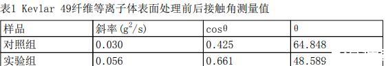 測(cè)量結(jié)果如下表所示,測(cè)量結(jié)果為三次平行樣的平均值。可見經(jīng)等離子體表面處理后,芳綸纖維與水的表面接觸角降低16°,潤濕性提高。