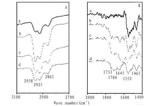 圖5化合物1在不同亞相時轉(zhuǎn)移30層膜的FT-IR圖譜