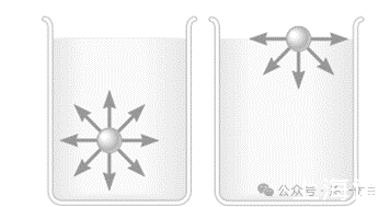 上圖左邊表示的是液體內部的水分子,受到周邊水分子各個方向均勻的吸引力,合力為零;右邊表示處于表面的水分子,受到下方水分子的吸引力,上方無水分子不存在吸引力,這樣下方水分子合力不為零,方向往液體內部。