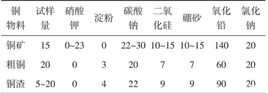 配料前可根據(jù)待測物組分確定熔渣的硅酸度,然后計(jì)算各熔劑的需要量。同時(shí)根據(jù)試樣還原力試驗(yàn)結(jié)果(或理論計(jì)算試樣的還原力)調(diào)整氧化劑或還原劑加入量。通過優(yōu)選實(shí)驗(yàn),推薦含銅物料的配料可按表1進(jìn)行。