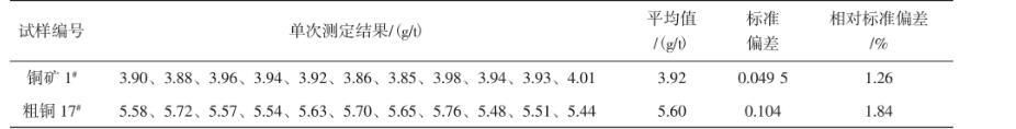 稱取20.00 g樣品,銅礦、銅渣樣直接干法試金配料,按試驗(yàn)方法進(jìn)行分析,結(jié)果見表4和表5。