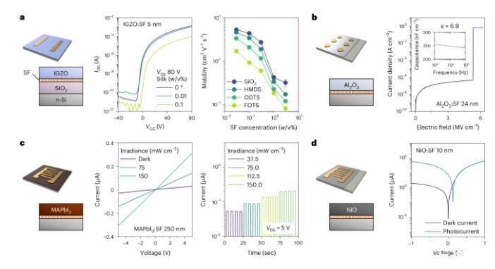 圖4展示了使用SF表面活性劑在憎水表面上制造水基納米器件的過程及其特性。研究發(fā)現(xiàn),SF的自分離特性在不影響器件性能的情況下,保證了薄膜的質量和功能。在含有0.03 w/v%SF的IGZO晶體管中,遷移率保持在1至10 cm2/V·s之間,只有在SF濃度超過0.1 w/v%時才略有下降。即使在疏水性表面上,SF的存在也沒有顯著影響電荷遷移率或引起非理想狀態(tài)(圖4a)。在電介質材料中,SF摻雜的Al2O3薄膜顯示出良好的電氣性能(圖4b)。SF還被成功應用于制造基于MAPbI3和NiO的光電薄膜,這些薄膜在光照下產(chǎn)生光電流(圖4c,d)。相比商用表面活性劑,SF用量更少且對器件性能影響更小,并具有生物友好性,適用于生物活性傳感器和人機電子界面等領域,展示了在環(huán)保和經(jīng)濟效益上的優(yōu)勢。