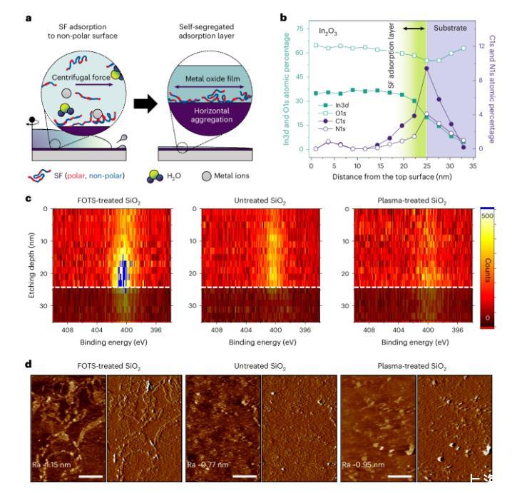 圖3a顯示了絲蛋白(SF)在不同表面能的基底上的吸附機制,假設疏水結構域與非極性表面相互作用,而親水結構域則面向溶液。作者通過X射線光電子能譜(XPS)和原子力顯微鏡(AFM)分析了摻有不同濃度SF的溶液在不同表面上的表現(xiàn)。XPS結果顯示,在非極性基底上,高濃度SF溶液形成了含有蛋白質的薄膜,并且在高能離子轟擊下薄膜和基底界面上仍保留有N1s信號(圖3b,c)。AFM分析則揭示了不同基底上的表面拓撲結構,非極性基底上呈現(xiàn)平躺形狀,而極性基底上則顯示島狀聚集體(圖3d)。研究表明,SF的吸附效率受表面能和分子量影響,并可有效增強潤濕性。這一適應性吸附機制有助于在不同表面上快速形成高質量金屬氧化物薄膜,無需調整沉積參數(shù)。