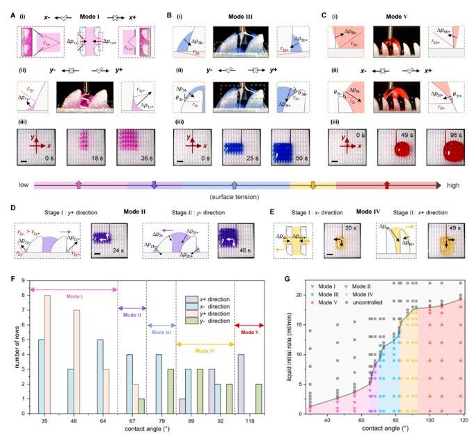 注入結(jié)構(gòu)化表面的液體首先填充相鄰四個單元間的空隙,并在單元的特定曲率結(jié)構(gòu)處形成局部曲率不等的液體彎月面,這導致液體表面不同位置的拉普拉斯壓差不同,進而驅(qū)動液體定向運輸。隨表面張力從低到高(22-72 mN/m),液體呈現(xiàn)出五種不同的運輸模式(I至Ⅴ)。研究人員利用水-乙醇溶液對這五種模式下液體沿x軸和y軸方向上的運輸行為進行力學分析(圖2)。表面張力較低的液體對界面的潤濕性較高,因此主要在單元底部曲率結(jié)構(gòu)作用下,沿拉普拉斯壓差較低的方向運輸;而表面張力較高的液體會在結(jié)構(gòu)化表面上積累,其運輸方向由單元頂部曲率調(diào)控。