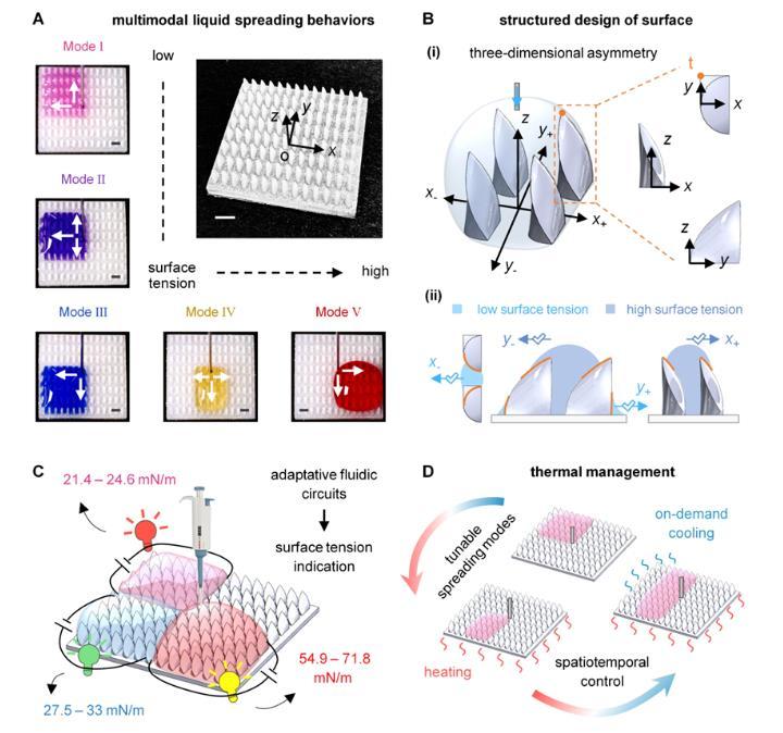 圖1:結(jié)構(gòu)化表面上的多向液體運輸行為及潛在應用。