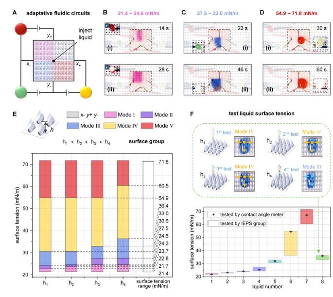 為實現(xiàn)多向調(diào)控液體,香港理工大學王立秋教授團隊提出了由陣列式三維不對稱尖牙結(jié)構(gòu)單元組成的結(jié)構(gòu)化表面,為不同表面張力液體定制運輸方向,并呈現(xiàn)出五種新穎的運輸模式(圖1)。這種智能調(diào)控液體的能力源于所設計表面單元自下而上分布的多曲率特征,在三維空間上交替地主導液體表面的局部拉普拉斯壓差,從而原位控制不同潤濕性液體的多樣定向運輸模式。該表面根據(jù)液體特性實施多模式控制的能力使其具備傳統(tǒng)結(jié)構(gòu)化表面難以實現(xiàn)的創(chuàng)新功能,如構(gòu)建自適應液體電路、便攜式表面張力指示器、智能調(diào)控液體及按需熱管理。該研究以“In Situ Multi-Directional Liquid Manipulation Enabled by 3D Asymmetric Fang-Structured Surface”為題發(fā)表于《Advanced Materials》,團隊博士生孫思琦為論文第一作者,王立秋講席教授為通訊作者,張藝媛研究助理教授為共同通訊作者。