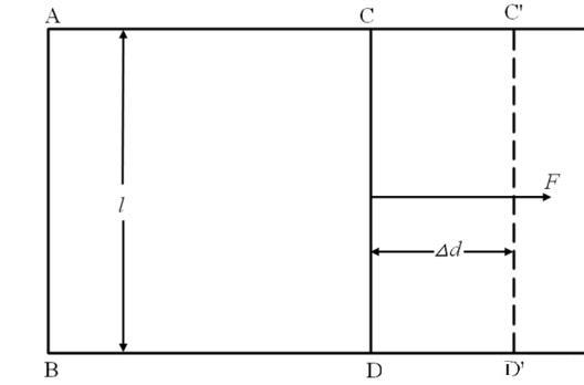 研究液體表面張力隨液體濃度、溫度、壓強等的變化規(guī)律的論著很多,卻很少有人研究液體表面張力隨液面拉伸程度的變化規(guī)律,從而隱喻了一種結(jié)論,即液體在濃度、溫度、壓強等條件不變時,其表面張力的大小不會隨其表面被拉伸的程度而改變。多部專著都有這樣的經(jīng)典的論述,圖1所示的矩形金屬絲框覆有液膜,其中CD為活動邊,長為l,欲使體系平衡,必須施以適當?shù)牧于CD邊上。CD邊在力F作用下克服液膜表面張力的阻礙而移動距離Δd,對體系做功ΔA=F×Δd,F(xiàn)=2γ×l,γ=F/2l為CD邊的液體表面張力系數(shù)。在此論述中,先驗地將液體表面張力視為不隨液膜面積變化而改變的恒量。