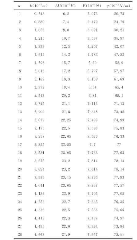 將拉力框置于待測液體中,調(diào)節(jié)好刀口與液面的平行度。讓液面緩慢上升至與刀口接觸。然后下降液面,形成并拉伸液膜至液膜斷裂。記錄此過程中液面在不同高度(即液膜不同拉伸長度)時的位置及此時力敏傳感器的讀數(shù)U,根據(jù)f=kU,(力敏傳感器的轉(zhuǎn)換系數(shù)k=340.2×10-6N/mV),可計算出不同高度的受力大小fn。