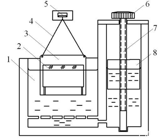 新型表面張力測試儀基本結(jié)構(gòu)如圖2所示,該儀器盛有液體(1),儀器采用連通器結(jié)構(gòu),截面積較大的左端放置拉力框(3),截面積較小的右端設有升降塊(8),旋動栓鈕(6)和螺桿(7),可使升降塊(8)上升或下降,從而引起液面相應的但速度更緩慢的升降。為減小液面升降時的波動,容器的兩端通過若干均勻分布的小孔相連通。為便于觀測液面位置,容器壁采用透明的有機玻璃材料,通過讀數(shù)顯微鏡確定液面高度。