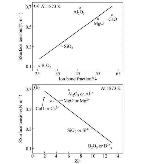 純氧化物表面張力主要與離子間的鍵能有關,形成氧化物的離子的靜電勢(Z/r)大,且離子鍵分數高的氧化物有較大的表面張力。純組分氧化物的靜電勢和離子鍵分數如圖3所示。純液態B2O3屬于表面活性物質,在1873 K時的表面張力約為0.104 N/m,僅為MgO、CaO、Al2O3和SiO2同溫度純物質表面張力數據的1/6~1/3。Si4+和B3+離子雖然靜電勢很高,但其離子鍵分數較低(<50%),易形成共價鍵高、靜電勢小的絡離子,從而其表面張力值較??;Mg2+、Ca2+和Al3+離子雖然靜電勢較小,但離子鍵分數較高,從而具有較高的表面張力值。
