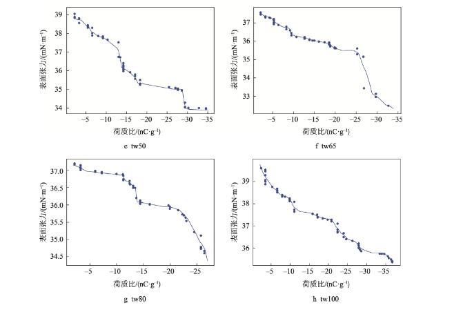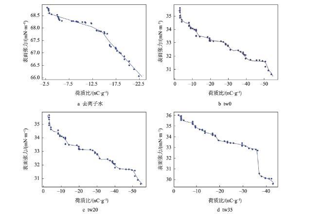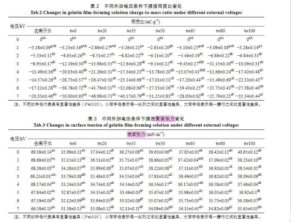 隨著膜液中吐溫20的減少和司盤20的增多,明膠液滴荷質(zhì)比亦呈增高趨勢(<0.05)。張建桃等[13]研究表明,介質(zhì)的電導率改變會引起其荷電性能的改變。相同質(zhì)量濃度下司盤20的物質(zhì)的量濃度更高,導致溶液電導率及液滴荷質(zhì)比增加更為明顯。然而,與只添加吐溫20的明膠溶液(tw100)相比,少量司盤20的添加(tw80)還會引起荷質(zhì)比的顯著減少(<0.05),推測這是由于溶液中吐溫20與司盤20分子通過“經(jīng)典疏水作用”在水溶液中優(yōu)先結(jié)合,從而使溶液中總?cè)苜|(zhì)相對濃度下降導致[14]。