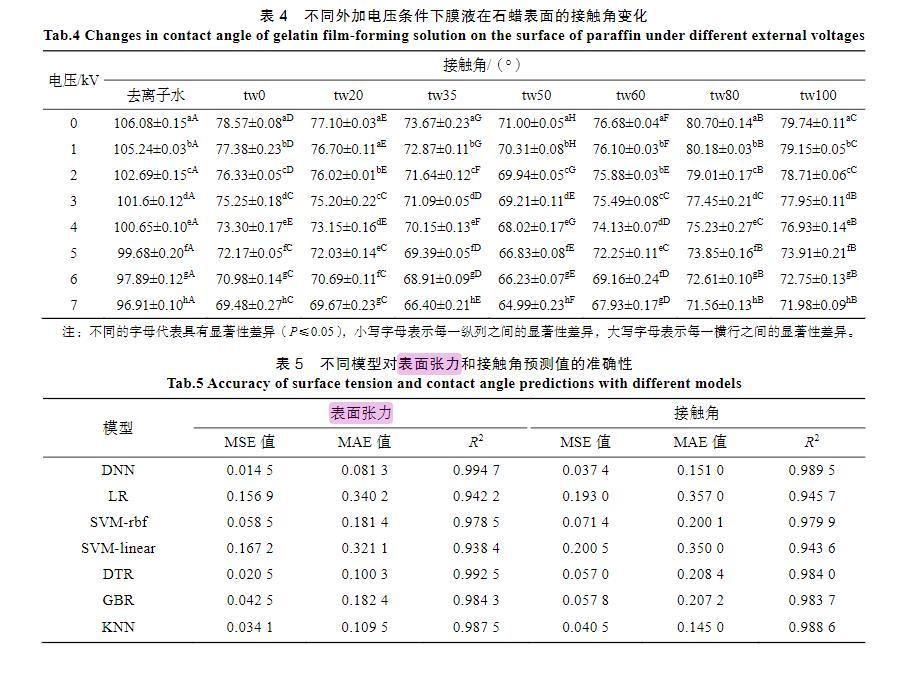 本文探究了在不同電源電壓下通過感應荷電的方式對明膠液滴荷質(zhì)比、表面張力及接觸角的影響,并通過深度神經(jīng)網(wǎng)絡建立模型預測。結(jié)果發(fā)現(xiàn),靜電荷電能有效提高明膠液滴的潤濕性能,當外加電壓為7 kV時,明膠成膜液滴的表面張力可以下降9%~14%,接觸角能夠下降8%~12%。從而為形成更均勻、更完整的可食性涂膜提供新的手段。在明膠的質(zhì)量分數(shù)為3%、表面活性劑的質(zhì)量分數(shù)為0.05%、吐溫20與司盤20濃度比為1∶1、電壓為0~7 kV時,深度神經(jīng)網(wǎng)絡模型對膜液荷質(zhì)比與表面張力或接觸角的關系具有良好的預測作用,可用于指導實踐操作。
