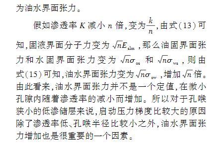 式(15)可知,油水界面張力變?yōu)閚σow,增加n倍。由此看來(lái),油水界面張力并不是一個(gè)定值,在微小孔隙內(nèi)隨著滲透率的減小而增加。所以對(duì)于孔喉狹小的低滲儲(chǔ)層來(lái)說(shuō),啟動(dòng)壓力梯度比較大的原因除了滲透率低、孔喉半徑比較小之外,油水界面張力增加也是很重要的一個(gè)因素。