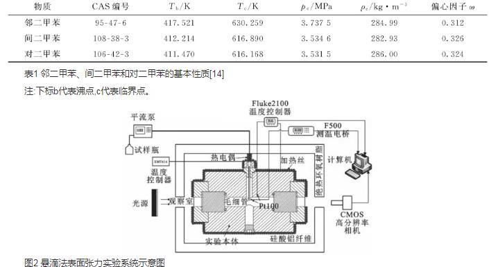表面張力是流體重要的物性參數(shù),在化工生產(chǎn)過程和燃料噴射霧化中具有重要的作用。根據(jù)公開文獻調(diào)查發(fā)現(xiàn),鄰二甲苯、間二甲苯和對二甲苯的表面張力實驗數(shù)據(jù)的溫度范圍有限,且沒有給出可靠的計算方程,如鄰二甲苯和間二甲苯測量的實驗溫度范圍均為303.15——343.15 K,共14個實驗點,對二甲苯的實驗溫度范圍為296.037——333.92 K,僅有3個實驗點,大多數(shù)文獻只給出了常溫附近的單點值。另外,各研究人員的測量結(jié)果之間存在較大偏差,如鄰二甲苯的最大偏差超過1 mN·m-1,對二甲苯的最大偏差為0.84 mN·m-1,因此非常有必要對其表面張力開展進一步的研究。本課題組開發(fā)出上述3種物質(zhì)的多參數(shù)Helmholtz狀態(tài)方程,可用于準確計算氣液相區(qū)密度。