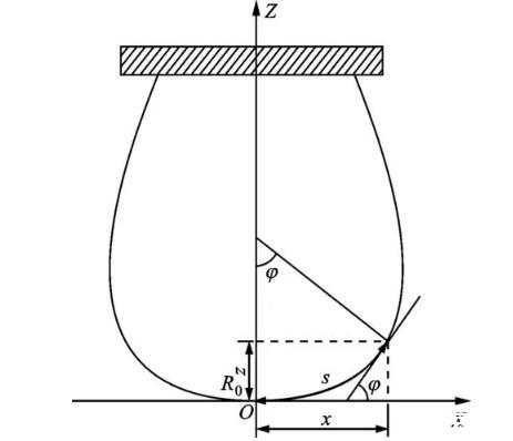 懸滴法利用測定處于重力與表面張力平衡狀態(tài)的液滴外形,獲得待測液體的表面張力。懸滴外形的幾何關(guān)系如圖1所示,在考慮液體靜壓作用的基礎(chǔ)上,由經(jīng)典Young-Laplace方程推導(dǎo)得歸一化Bashforth-Adams工作方程為,式中:σ為表面張力;φ表示外形輪廓線某點切線與橫坐標夾角;s為弧長;R0為頂點曲率半徑;ρl、ρg分別表示液相和氣相密度;g代表當?shù)刂亓铀俣龋疚娜?.7965 m·s-2。