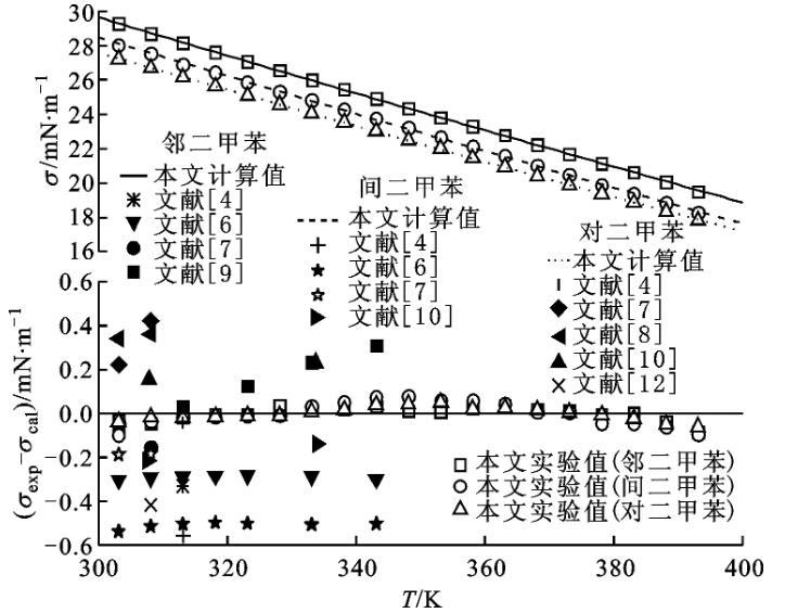 圖4鄰二甲苯、間二甲苯和對二甲苯表面張力與溫度關(guān)系以及與方程計算值和文獻值比較