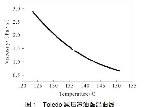 考慮到上述因素,本文在根據(jù)現(xiàn)有儀器測(cè)得的相對(duì)較低溫度條件下的黏溫曲線關(guān)系的基礎(chǔ)上進(jìn)行了減壓渣油較高溫度條件下黏溫關(guān)系的計(jì)算近似,以求對(duì)減壓渣油反應(yīng)模型進(jìn)行較為準(zhǔn)確的理論模型建立的指導(dǎo)。就目前的技術(shù)而言,在缺少直接測(cè)量?jī)x器以及相關(guān)行業(yè)標(biāo)準(zhǔn)的情況下,利用模型進(jìn)行計(jì)算模擬近似,是最具說(shuō)服性地技術(shù)手段。圖1為實(shí)驗(yàn)室中實(shí)際測(cè)得的在相對(duì)較低溫度下Toledo減渣的黏溫曲線。