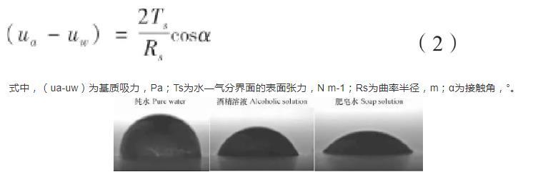 由上式可以看出,基質吸力的大小與表面張力、接觸角和曲率半徑有關。其中,基質吸力的大小與表面張力成正比,與彎液面曲率半徑成反比。因此,表面張力和曲率半徑的變化均會導致基質吸力的改變。在環境溫度為25℃時,通過JC2000型接觸角測量儀對三種試樣的孔隙液體進行接觸角測量。得到三種不同表面張力液滴的幾何形態圖如圖4所示,測量可得純水、酒精溶液和肥皂水對應的接觸角分別為85°、65°和42°,而在25℃環境下,純水、20%酒精溶液、2 g L-1肥皂水的表面張力系數分別為:7.1×10-2N m-1、4.1×10-2N m-1、2.9×10-2N m-1。表面張力是決定彎液面形狀的主要因素之一,會影響曲率半徑和接觸角的大小。很顯然,表面張力大的液體接觸角變大,曲率半徑變小。圖4中水滴表面張力大于酒精溶液,但形成的彎液面半徑卻要小于酒精溶液,同樣的,酒精溶液形成的彎液面半徑又小于肥皂水。曲率半徑越小,土體中的基質吸力越大??紫端砻鎻埩澮好娴那拾霃疆a生改變從而對基質吸力產生影響,最終影響土壤的收縮開裂。