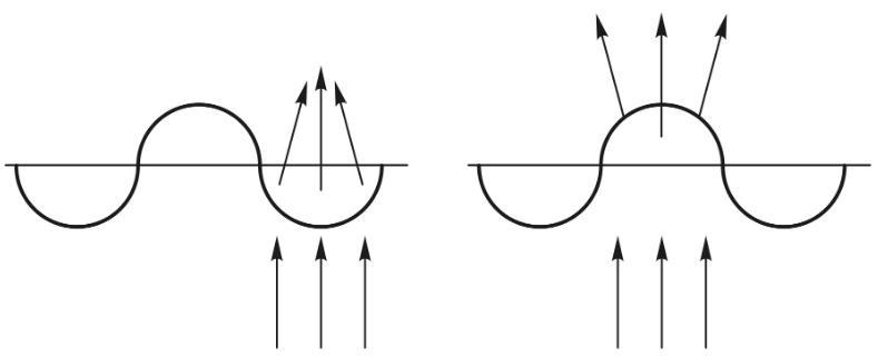 由于水波傳播速度較快,難以直接觀測水波的傳播情況和波峰位置。實驗中通過錄制視頻的方式來觀測水波傳播的過程。首先將透明水槽放置在固定高度的底座上,在水槽下方放置光源。水波波動時表面的起伏會像凸透鏡、凹透鏡一樣將光線會聚或發(fā)散(圖3),此時在水面上方放置整潔的紙張作為屏幕承接光線,便可以看到明暗相間的區(qū)域,分別對應(yīng)水波的波谷和波峰。同時,若將透明的刻度尺放入水中,則可以將刻度尺一同投影到屏幕上,從而測量出水波的位置數(shù)據(jù)。然后,將攝像設(shè)備(手機及手機支架)放置在屏幕上方拍攝屏幕上水波的光投影(圖4),記錄水波傳播的過程。最后,使用電腦單幀播放錄制的視頻,從而放慢水波傳播的過程以便于準確測量波峰位置。此外,由于水滴滴落時形成的是形如同心圓的一組水波,便可以在單幀畫面中測量多個相鄰波峰的位置得到波長。