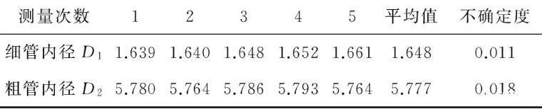 在組裝不等徑U型管之前,用讀數顯微鏡分別測量兩支玻璃管的內徑,取5次測量的平均值,記為D1、D2.測量數據列于表1.