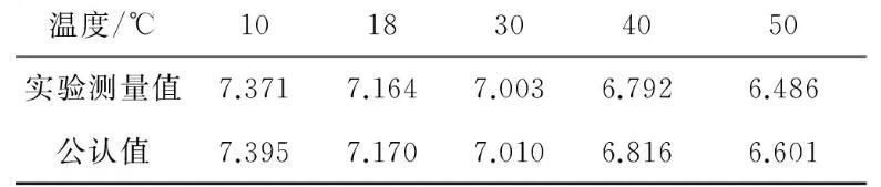 將不等徑U型管內徑以及液位差的測量數據代入式(8)中,計算得到對應溫度下的表面張力系數的測量值。查閱已有文獻,可以得到不同溫度下純凈水表面張力系數的公認值以及數據擬合出的公式α=75.45067-0.13326t-5.26468×10-4t2.實驗測量值與公認值對比列于表3.