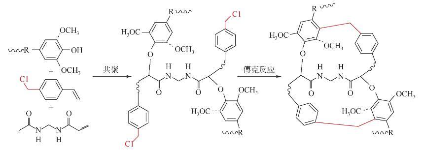 以上文獻表明木質素基多孔聚合物作為吸附劑擁有巨大潛力,但目前報道的木質素基聚合物的比表面積仍相對較小,且多為介孔大孔結構,雜原子含量不高,吸附性能仍有待提高。此外,將其應用于放射性碘捕獲也很少有文獻報道。基于此,本文擬采用多步化學交聯(lián)策略,即先通過自由基共聚反應接枝一定量的可烷基化或酰基化基團的芳香族單體,且聚合中加入少量含雜原子的雙烯單體,使其得到理想的親疏水性以及充足的碘親和位點。接著,通過Friedel-Crafts反應使上述內親電試劑在木質素共聚物的大分子鏈之間搭建大量由亞甲基等剛性基團形成的交聯(lián)橋,原位構筑剛性結構支撐的雜原子修飾木質素基超交聯(lián)聚合物,從而保證其對碘蒸氣或碘溶液具有快速的吸附速率、良好的穩(wěn)定性和高的吸附容量。