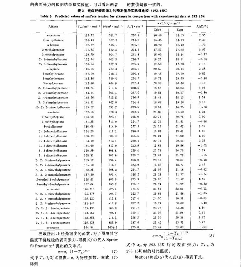 對Davis和Rosseinsky提出的關系檢驗表明,液體的表面張力σ與P1Vm1/3之比不僅取決于溫度,還與液體的種類有關,據此,建立了一個能由鏈烷烴的分子結構準確預測其表面張力的方法。