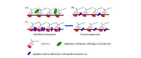 隨著時(shí)間的推移,界面上的活性分子由無(wú)序排列轉(zhuǎn)變?yōu)橛行蚺帕?,如圖6(C)所示。在此過(guò)程中,界面活性分子的脫附速率大于吸附速率,界面濃度不斷減小,導(dǎo)致IFT升高直到脫附速率等于吸附速率。因此,DIFTs曲線(xiàn)呈“V”型。在此情況下,IFTmin不等于IFTequ.結(jié)果表明,小分子尺寸的瀝青質(zhì)及其亞組分與P-S14-4分子的協(xié)同作用主要體現(xiàn)在瞬時(shí)的IFTmin值上。也可通過(guò)圖5證實(shí),隨著A,A3和A4濃度的增加,IFTmin明顯降低,這表明隨著分子尺寸較小的瀝青質(zhì)組分濃度的增加,混合吸附膜變緊密,協(xié)同作用增強(qiáng)。瀝青質(zhì)主要通過(guò)與表面活性劑形成混合吸附膜和改變油相的性質(zhì)來(lái)影響IFT。