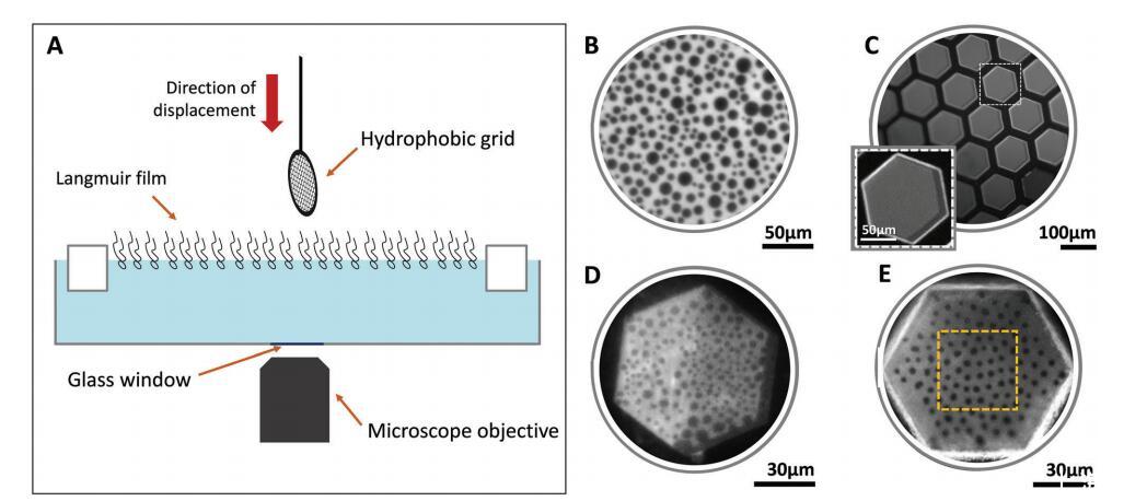 圖 1 用于生成和觀察朗繆爾單層和平面獨立雙層的實驗裝置 (A)。 代表性圖像顯示 表面壓力為 28 mN m 的中性朗繆爾單層膜? 1 (B), 轉移后立即包含多個同質雙層 (C) 的網格, 和 突出顯示的孔(C 中的插圖)的放大圖,以及顯示相共存的中性 (D) 和帶電雙層 (E)。 橙色虛線方塊 (E) 中顯示的是用于分析的區域的示例。