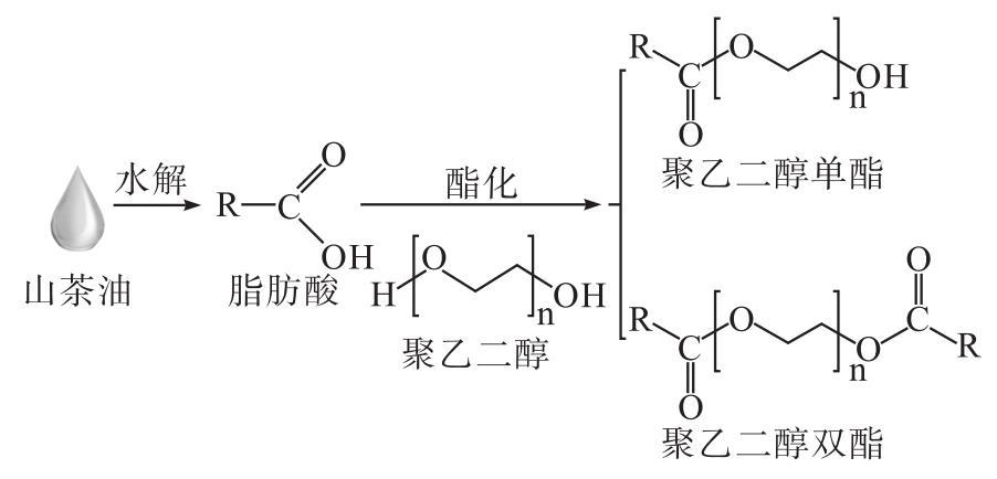 為了解決上述問題,本文以聚乙二醇600(PEG600)和山茶油水解產物為原料,通過水解-酯化兩步法制備改性山茶油,并對其各項性能指標進行評價,為山茶油在水劑型化妝品中的應用提供數據支持。改性山茶油的制備原理如圖1所示。