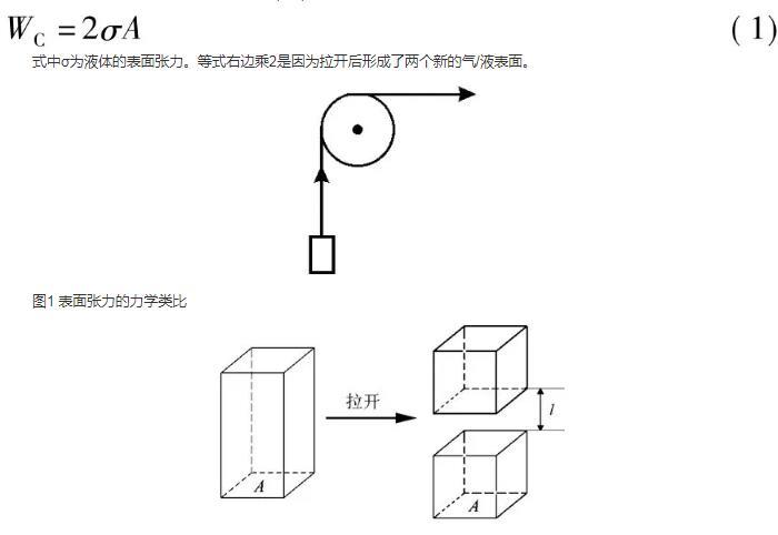 設(shè)想有一柱狀液體,將它拉開分成兩半(圖2)。若液體的橫截面積為A,則不難得到拉開時需做之功為: