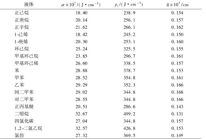 表1 293.15K時若干液體的表面張力、內(nèi)壓力和表面層厚度