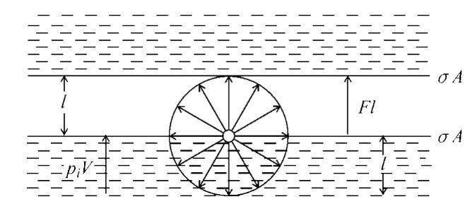 式中pi=(?U/?V)T是內(nèi)壓力的熱力學(xué)定義,式(5)便是本文所得結(jié)果。由此可見,表面張力與內(nèi)壓力的關(guān)系是很簡單的,它不僅說明了縱向作用的內(nèi)壓力與表面上橫向作用的表面張力成正比,而且還能說明圖1所示的力學(xué)類比。圖3是該說明的示意圖。