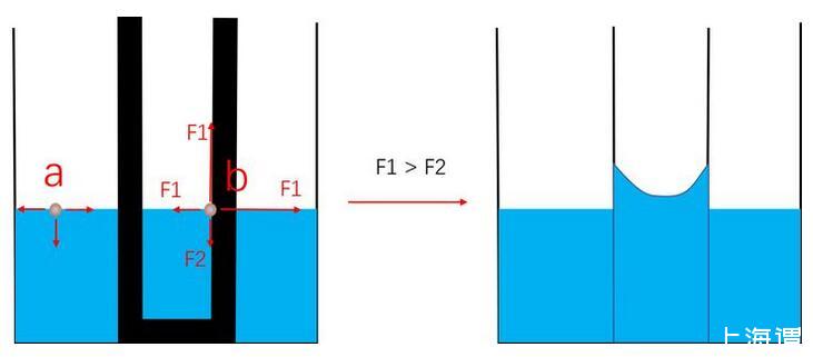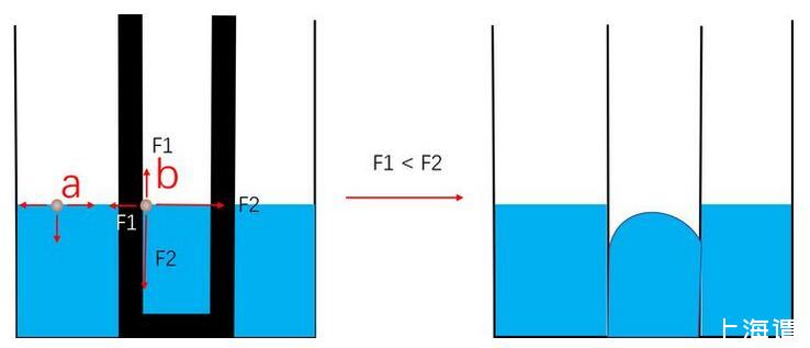 自由界面處的水分子只受到水分子的作用,如a處所示。而對(duì)于b處界面分子。其左側(cè)的分子被固體分子替代,這個(gè)替代產(chǎn)生了固液分子作用力(F1)與液液分子作用(F2)的差別,這個(gè)差別使液面運(yùn)動(dòng)。