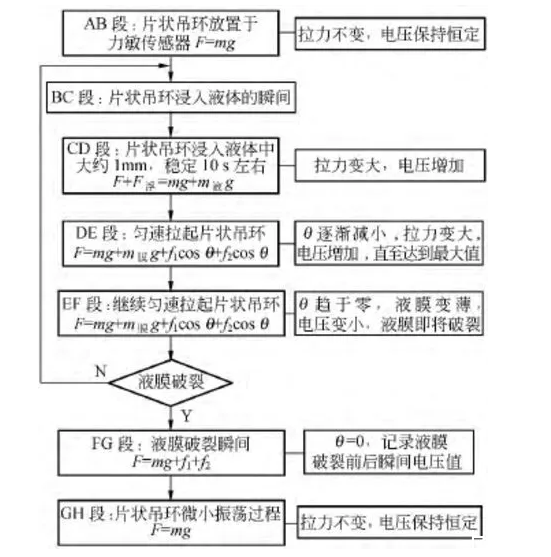 根據受力情況將圖4的液膜拉脫過程電壓變化曲線分為6個階段,圖5為液膜拉脫過程方框圖,不同階段片狀吊環的受力情況不同,電壓變化值也不同,在液膜破裂前后瞬間,忽略液膜的重力,表面張力與重力方向完全一致,此時F=mg+f1+f2,可得到液體的表面張力。由圖4發現,不同液體在EF階段的電壓變化情況不同,無外加磁場作用時2F號磁性液體在EF階段存在轉折點Q,越過轉折點,QF階段電壓變化較平緩,且表面張力越小;而7#白油和1F磁性液體并未出現此現象。出現該現象的原因是7#白油和1F磁性液體表面張力較大,當液膜被拉脫到一定程度時,很快破裂;而2F號磁性液體由于表面張力較小,液體分子與分子之間的作用力減弱,宏觀表現為拉脫的液膜更長,液膜在空氣中會存在一段時間,此時液膜質量很小,可忽略不計,電壓變化較平緩。有外加磁場作用時,1F和2F號磁性液體在FG階段并未出現電壓變化平緩的中間過程,但有外加磁場作用于磁性液體時,FG階段出現了一些數據點,液膜破裂的時間大于無外加磁場作用時的時間,主要是由于外加磁場增強了磁性顆粒之間的相互作用,分子和分子之間的磁吸引力增強,導致液膜逐步破裂。