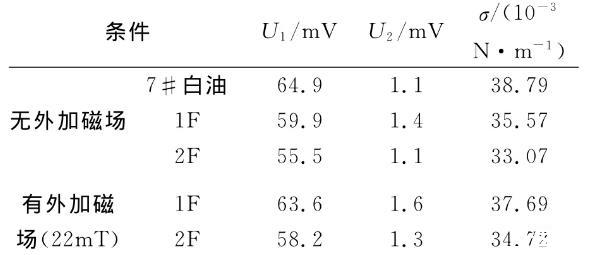 計算機實時在線采集了2種磁性液體及白油液膜拉脫過程中電壓隨時間的變化曲線,如圖4所示。從圖4可看到,3種液體的電壓變化規律一致,圖中F和G兩點是液膜破裂前后瞬間的電壓值,片狀吊環的內外徑分別為33.10mm和34.69mm,根據(6)式即可計算出液體的表面張力。室溫(20±0.5)℃時各液體的表面張力見表2.7#白油的表面張力大于磁性液體,這主要是因為表面活性劑的加入降低了液體的表面張力。當22mT的磁場作用于磁性液體時,磁性液體的表面張力增加,這主要是因為無外加磁場作用時,各磁性顆粒的磁矩方向雜亂無章,互相抵消,磁性液體不顯示宏觀磁性。當外加磁場作用于磁性液體時,且磁場方向平行于切線方向的磁性液膜時,各磁性顆粒的磁矩方向轉向外加磁場方向,外加磁場增強了磁偶極子之間的相互作用,導致磁性液體的表面張力增加。