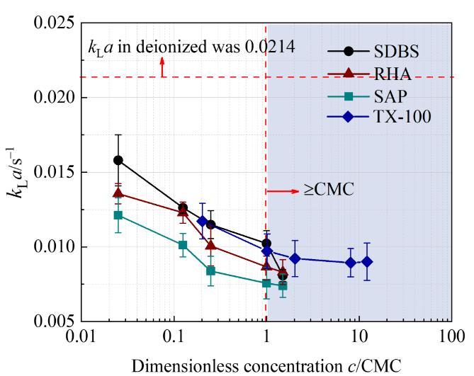 含表面活性劑微納米氣泡曝氣系統(tǒng)的體積傳質系數(shù)(kLa)值如圖2所示。在四種表面活性劑溶液中,kLa值均隨表面活性劑濃度增加而降低。當c/CMC小于1時,降低的趨勢更明顯。這說明少量的表面活性劑即可對傳質產(chǎn)生顯著影響。此外,非離子型表面活性劑對kLa的影響大于離子型表面表面活性劑。分子量大的RHA比SDBS具有更顯著的傳質抑制作用。