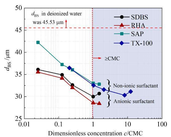 在不更新氣泡表面和表面活性劑分子抑制凝聚的共同作用下產(chǎn)生了粒徑更小的微納米氣泡。表面活性劑濃度大于CMC值的溶液中的微納米氣泡的粒徑小于表面活性劑濃度小于CMC的溶液中的。該現(xiàn)象主要是因為當表面活性劑濃度小于CMC值時,表面活性劑分子不足以完全覆蓋氣泡表面。另外,如圖1所示,隨著濃度增加,微納米氣泡的粒徑降低,當c/CMC值大于1時,溶液的表面張力達到了穩(wěn)定值,但微納米氣泡的粒徑持續(xù)減小。