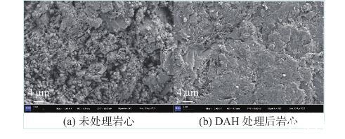 將打磨好的未處理巖心和防水鎖劑DAH處理后的巖心采用掃描電鏡進行測試,結(jié)果如圖9所示。由圖9(a)可知,未處理的巖心表面較為粗糙,存在較多大顆粒與微孔隙,在親水礦物和毛細(xì)管力的綜合作用下,巖心表面呈親水性。如圖9(b)所示,DAH處理后的巖心表面更為光滑,微孔隙數(shù)目減少,這是因為防水鎖劑中的DAT分子通過靜電作用在巖心表面吸附形成薄膜。DAT分子兩端的季銨結(jié)構(gòu)可以通過靜電作用吸附在砂巖表面,中間的聚硅氧烷鏈段具有良好的柔韌性和旋轉(zhuǎn)靈活性,使得DAT分子可以在巖心表面密集覆蓋。同時聚硅氧烷鏈段的柔韌性也使其兩側(cè)的甲基可以高密度堆積,這種堆積使得巖心表面獲得較強的疏水性,從而降低了液相返排阻力,減輕了水鎖損害。